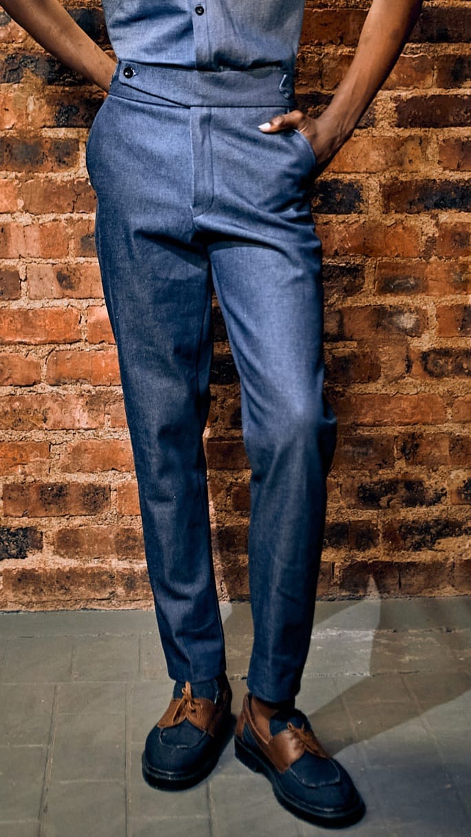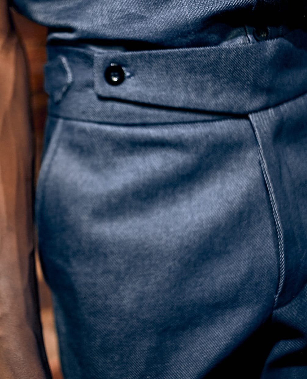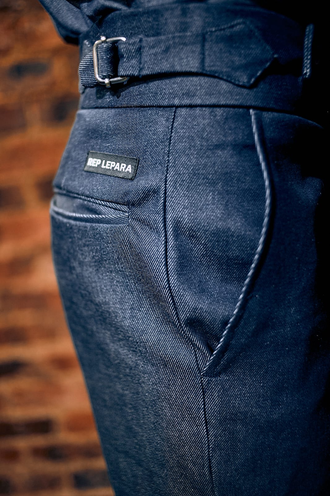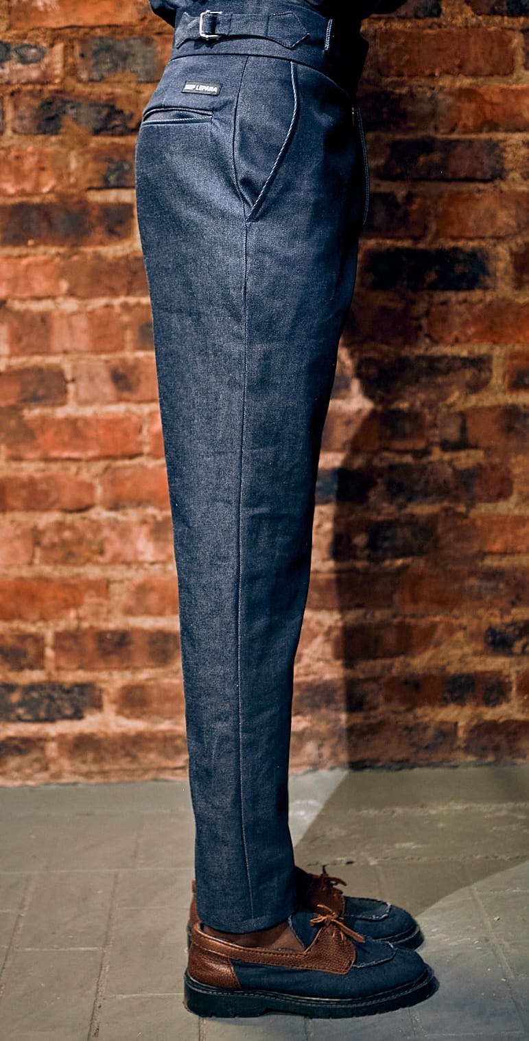 From our denim department capsule collection. This revised slim fit cut is made of raw denim with side adjusters on the sides. Designed to make a striking designer statement with its subtle details.